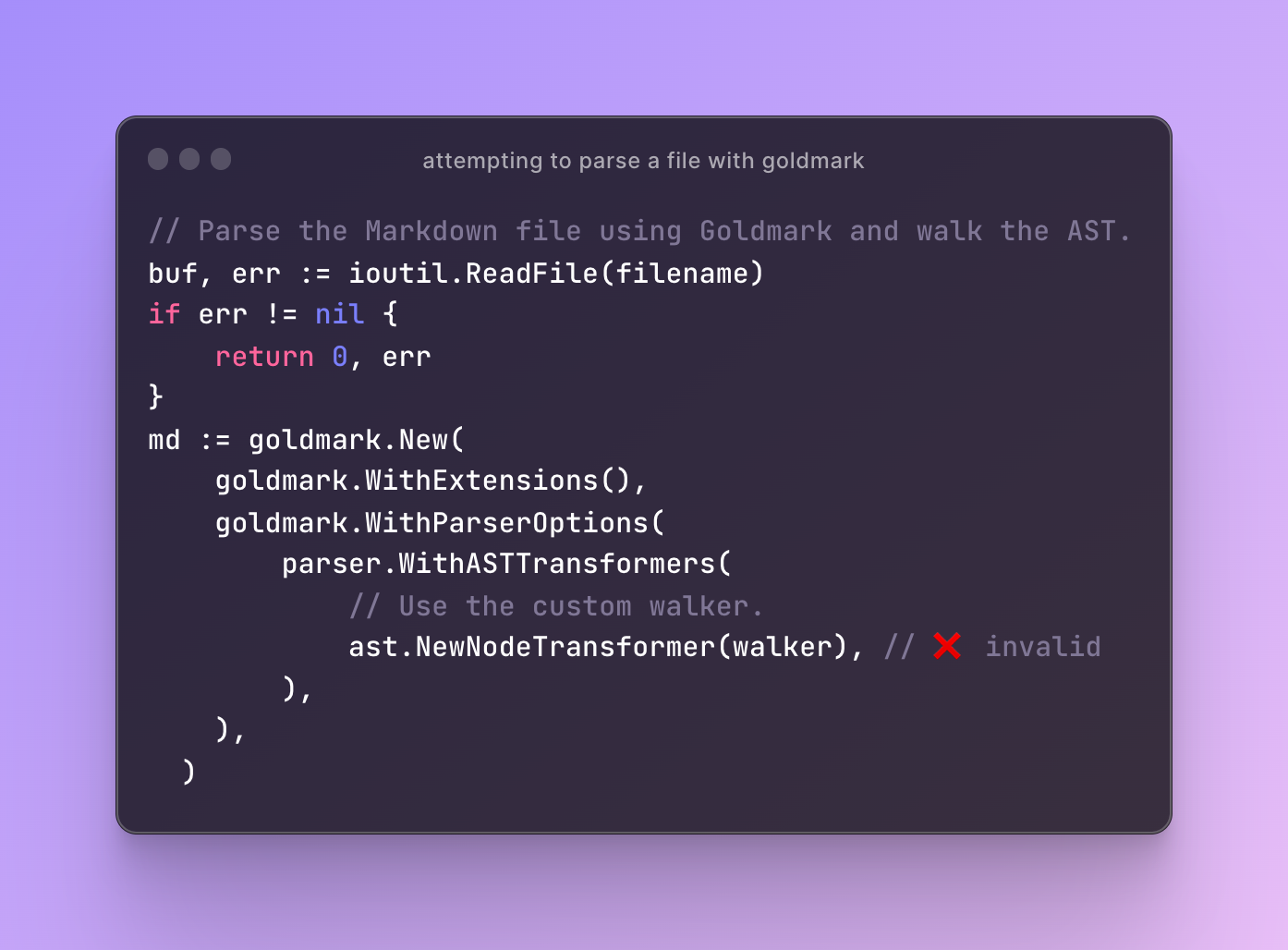This failed repeatedly. The code examples were promising but made up quite a few methods and approaches that were non-existent in the actual code base and had no code examples matching in the repo. Goldmark doesn't have a lot of use examples compared to many projects, so I think the quality of the suggestions degraded with a broader question.