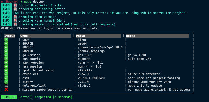 mage doctorcommand in your project that validates issues experienced and gets added to over time. This can help troubleshooting any environment or project issues if you maintain and add a list of checks being run. Using Pterm you can make this into a nice table output like this: